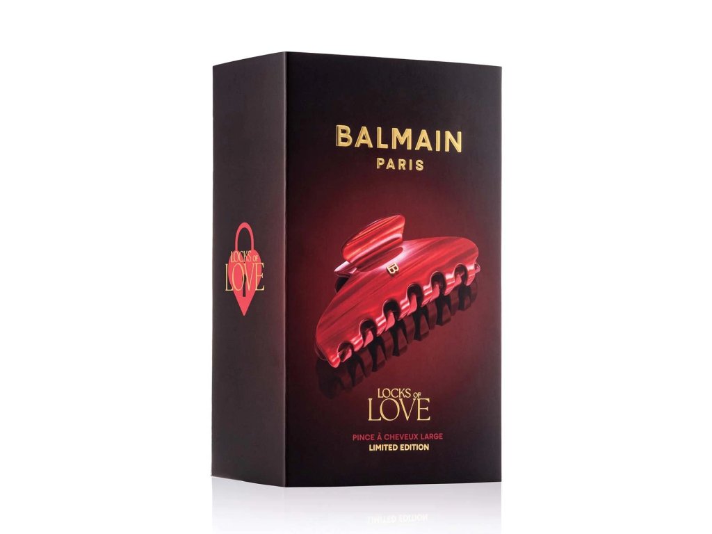 Ručně vyrobený skřipec z odolného acetátu celulózy zdobí charakteristické logo „B“ značky Balmain Hair potažené 18karátovým zlatem. Tato limitovaná edice velkých skřipců je k dispozici v červené barvě symbolizující nadčasovou romantiku kolekce Locks of Love.