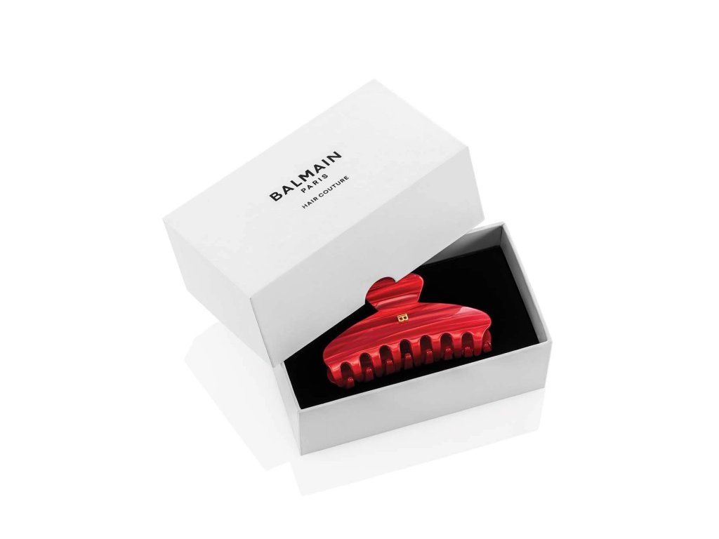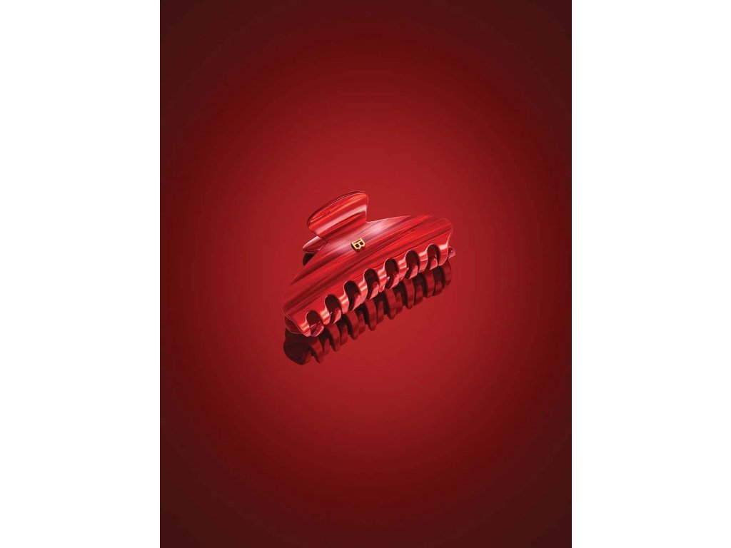 Skřipec, vyrobený z odolného acetátu celulózy a zdobený ikonickým logem „B“ značky Balmain Hair potaženým 18karátovým zlatem, je navržen v červené barvě vyjadřující charakteristickou vášeň kolekce Locks Of Love.